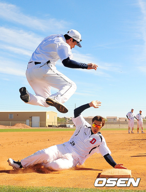 26일(이하 한국시간) 미국 애리조나주 피오리아 '피오리아 스포츠 콤플렉스'에서 진행된 두산 스프링캠프에서 두산 이종욱이 슬라이딩을 할때 김민호 코치가 점프하며 피하는 훈련을 하고 있다.