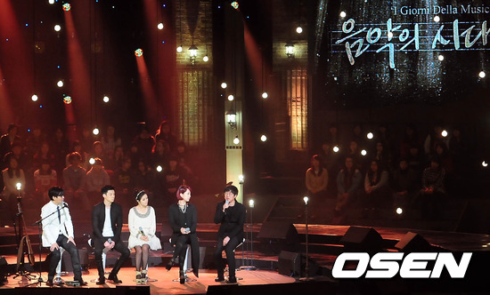 [OSEN = 백승철 기자] 26일 오후 고양시 아람누리 아람극장에서 열린 MBC MUSIC 채널 개국특집 방송 '음악의 시대'녹화 현장에서 윤상, 김광진, 팀, 제이, 박기영이 '행복을 주는 노래'를 부르고 있다.