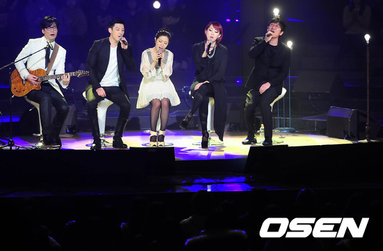 [OSEN = 백승철 기자] 26일 오후 고양시 아람누리 아람극장에서 열린 MBC MUSIC 채널 개국특집 방송 '음악의 시대'녹화 현장에서 윤상, 김광진, 팀, 제이, 박기영이 '행복을 주는 노래'를 부르고 있다.