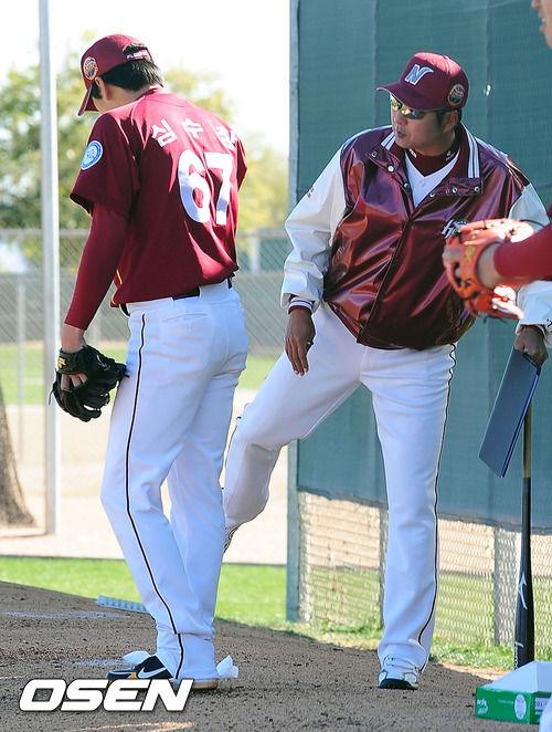 29일(한국시간) 미국 애리조나주 서프라이즈 '텍사스 레인저스 볼파크'에서 진행된 넥센 스프링캠프에서 정민태 코치가 심수창에게 투구폼에 대해 알려주고 있다.