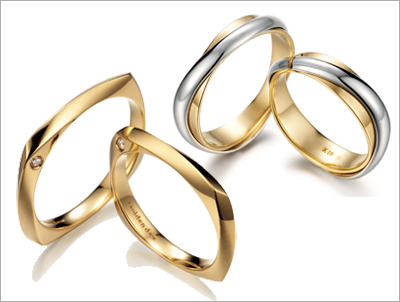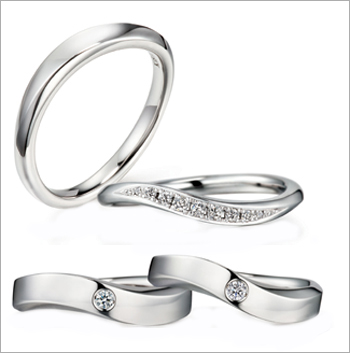 클래식한 느낌에 리드미컬한 음악적 움직임을 더해 마치 물결치는 듯 생동감을 불어넣은 제품이다. 깔끔한 화이트골드 금속 밴드의 남성 반지와 다이아몬드가 섬세하게 세팅된 여성 반지가 서로 조화를 이룬다.