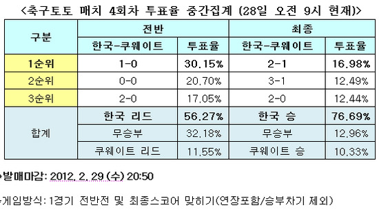 국민체육진흥공단(www.kspo.or.kr)이 발행하는 체육진흥투표권 수탁사업자 스포츠토토의 공식 온라인 발매 사이트 베트맨(www.betman.co.kr)이 오는 29일 오후 9시 서울월드컵경기장에서 열리는 한국(홈. FIFA랭킹 34위)과 쿠웨이트(원정· FIFA랭킹 91위)의 브라질월드컵 아시아지역 3차 예선을 대상으로 한 축구토토 매치 4회차 투표율 중간집계 결과, 전체 참가자의 76.69%는 한국이 쿠웨이트를 상대로 승리를 거둘 것으로 전망했다고 밝혔다.