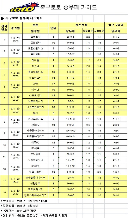 한편, 잉글랜드 프리미어리그(EPL)에서는 박지성이 속한 맨유가 토트넘에 승리(54.11%)해 리그 선두 탈환에 도전할 것으로 예상됐다. 토트넘은 북런던더비에서 아스널에 5대 2로 대패하며 분위기가 꺾여 있다. 칼링컵 우승을 차지한 리버풀은 올 시즌 원정에서 5승 2무 6패를 기록하며 부진한 아스널에 승리할 것(43.09%)이라는 예상이 가장 높게 집계됐다. 축구토토 승무패 9회차 게임은 3일 오후 2시 50분에 발매가 마감된다.