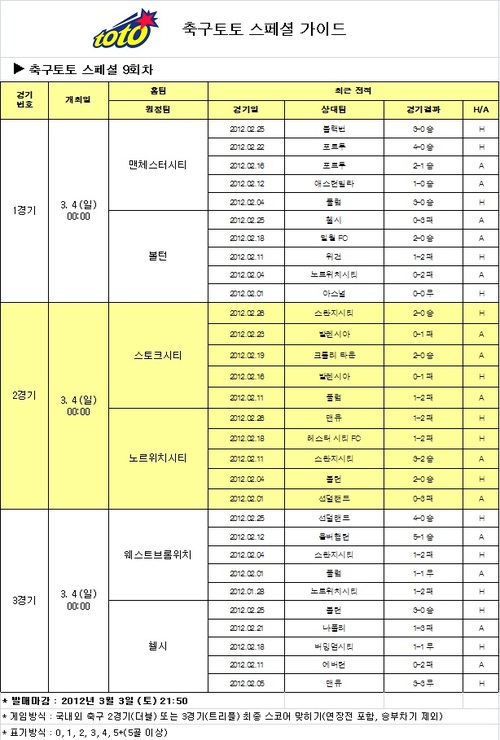 2경기 스토크시티-노르위치시티전에서는 스토크시티 승리 예상이 40.96%로 최다 집계돼, 무승부 예상 33.39%, 노르위치시티 승리 예상 27.66%보다 다소 높게 나타났다. 스코어별 투표율은 1-1 양팀 무승부 15.44%가 가장 높게 나타났다. 한편, 이번 축구토토 스페셜 9회차 게임은 3일 오후 9시 50분까지 게임에 참여할 수 있으며 경기가 모두 종료된 후에 결과가 공식 발표된다.