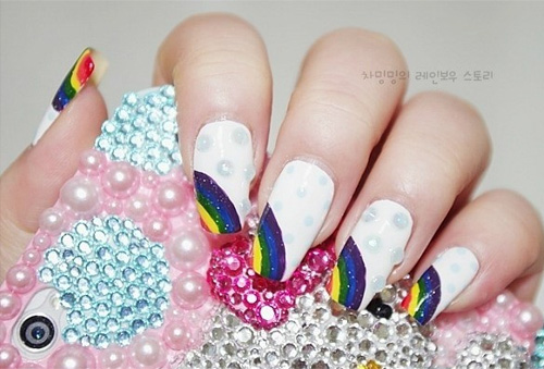 ‘무지개 네일아트’는 일곱 가지 무지개 색을 손톱 끝에 사선 스트라이프 무늬로 처리해 상큼하면서도 경쾌한 분위기가 특징이다. 특히 흰색 바탕에 하늘색 도트무늬를 이용해 빗방울의 이미지를 표현한 것이 감각적이기까지 하다.