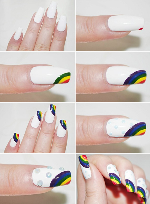 좀 더 이색적인 느낌으로 무지개 네일아트를 하고자 한다면 무지개 컬러의 순차를 섞어서 이용하거나, 원색 컬러 대신 파스텔 톤을 이용하는 방법이 있다.