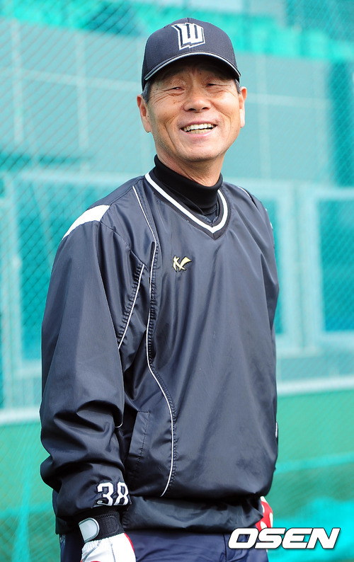 8일 오후 고양시 고양국가대표 야구훈련장에서 열린 고양 원더스와 LG 2군의 평가전 경기 시작 전 고양 원더스 김성근 감독이 취재진들과 이야기를 나누는 중 미소를 짓고 있다.