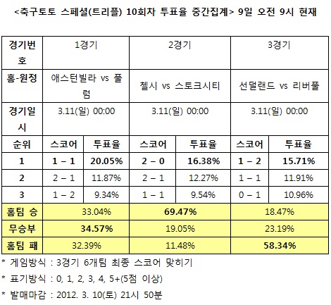 1경기 애스턴빌라-풀럼전에서는 무승부 예상 34.57%, 애스턴 승리 예상 33.04%, 풀럼 승리 예상 32.39%이 근소한 차이를 보였다. 스코어별 투표율은 1-1 양팀 무승부 20.05%가 가장 높게 나타났다. 한편 이번 축구토토 스페셜 10회차 게임은 10일 오후 9시 50분까지 게임에 참여할 수 있으며 경기가 모두 종료된 후에 결과가 공식 발표된다.