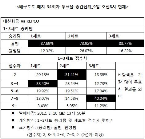 1~3세트 승리팀과 점수차를 맞히는 배구토토 매치 게임에서 세트별 예상 승리팀은 1세트(87.69%), 2세트(73.92%), 3세트(83.77%) 모두 대한항공으로 나타났다. 3세트까지의 각 세트별 예상 점수차는 1세트(38.40%)는 3~4점차, 2세트(31.41%)는 2점차, 3세트(40.04%)는 7~8점차가 가장 높게 집계됐다.