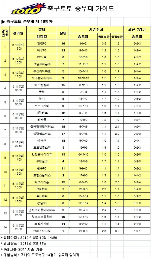 축구토토 승무패 10회차 게임은 10일 오후 2시 50분에 발매가 마감된다.