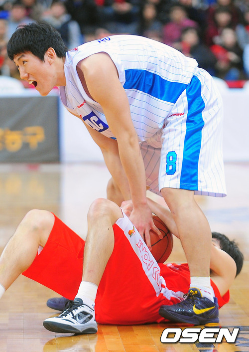 [OSEN=울산, 정송이 인턴기자]11일 오후 울산 동천실내체육관서 열린 2011-2012 KB국민카드 프로농구 6강 플레이오프 3차전 울산 모비스와 전주 KCC의 경기 1쿼터 KCC정민수가 모비스 양동근과 루즈볼 다툼을 벌이고 있다.