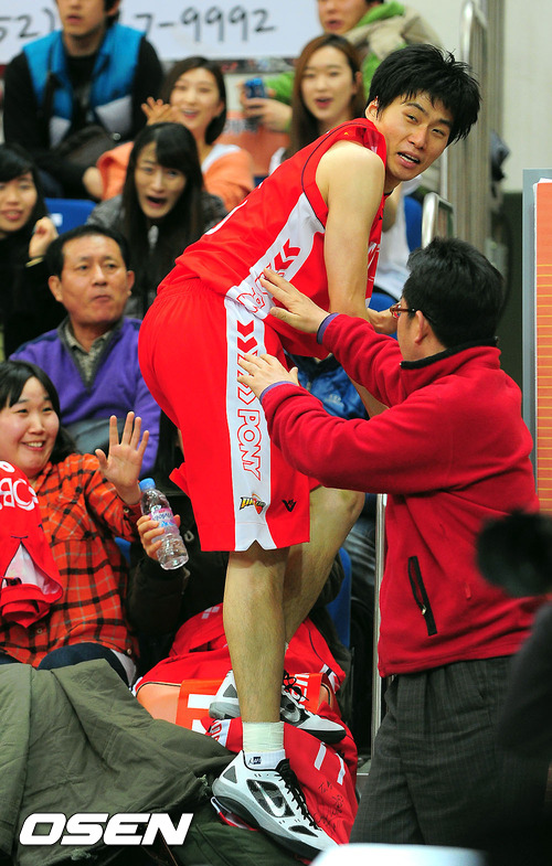 11일 오후 울산 동천실내체육관서 열린 2011-2012 KB국민카드 프로농구 6강 플레이오프 3차전 울산 모비스와 전주 KCC의 경기 3쿼터 모비스 박구영이 몸을 날려 라인아웃된 공을 살리고 있다