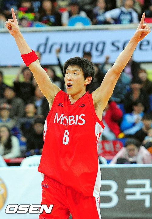 11일 오후 울산 동천실내체육관서 열린 2011-2012 KB국민카드 프로농구 6강 플레이오프 3차전 울산 모비스와 전주 KCC의 경기 4쿼터 모비스 양동근이 3점슛을 성공한 후 환호하고 있다.