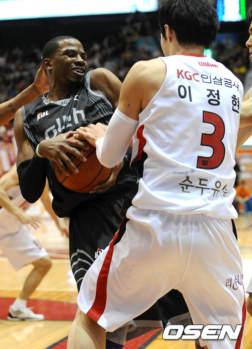 24일 오후 부산 사직체육관에서 벌어진 '2011~2012시즌 KB국민카드 프로농구' 4강 플레이오프(PO) 4차전 부산 KT와 안양 KGC의 경기, 2쿼터 KT 로드가 KGC 이정현과 볼다툼을 하고 있다.