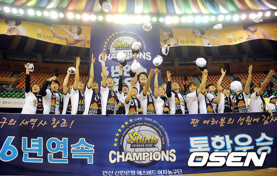 경기종료 후 신한은행 선수들과 임달식 감독이 우승 세리머니를 하고 있다./ soul1014@osen.co.kr
