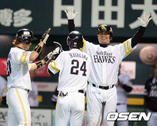 8회말 2사 1,3루에서 소프트 뱅크 하세가와 쇄기를 박는 스리런 홈런을 날리고 홈인 동료들의 환영을 받고 있다.
