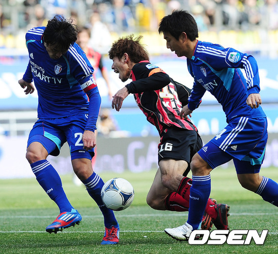 1일 오후 수원월드컵경기장에서 열린 '현대오일뱅크 K리그 2012' FC 서울과 수원 삼성의 경기, 전반 서울 하대성이 수원 곽희수 오범석 수비에 걸려 넘어지고 있다.
