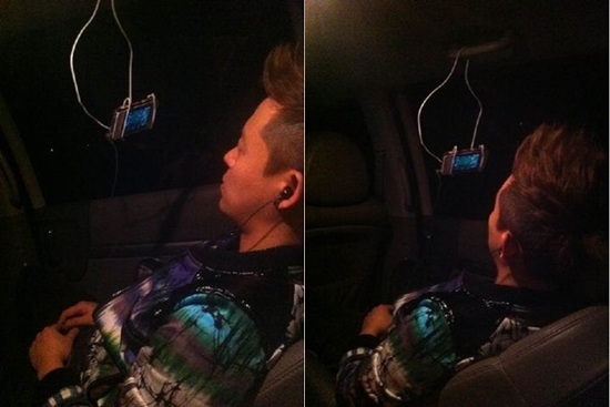 토니는 얇은 세탁소 옷걸이를 펴 차량 손잡이에 걸고 반대편 끝은 휴대폰을 고정할 수 있는 받침대로 만들었다. 사진 속 토니는 편하게 좌석 등받이에 기대어 휴대폰 동영상을 관람하고 있다.