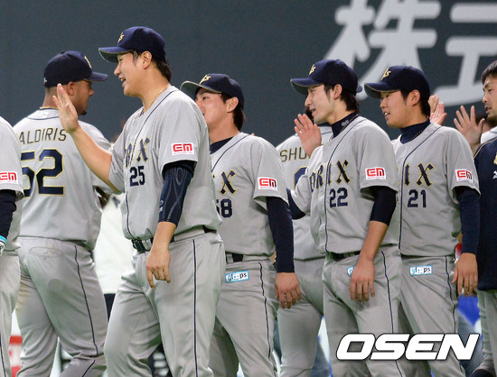 이대호가 경기 종료후 동료들과 승리의 하이파이브를 하고 있다.