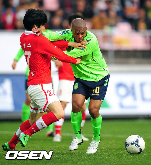 14일 오후 전주월드컵경기장에서 열린 '현대오일뱅크 K리그 2012' 전북 현대와 부산 아이파크의 경기 후반 전북 루이스와 부산 김창수가 볼 다툼을 하고 있다.