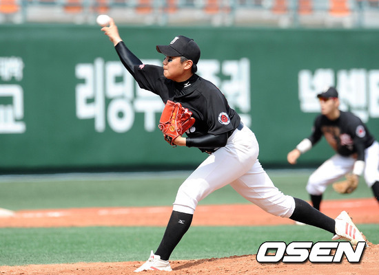 15일 오전 서울 목동야구장에서 열린 '2012 고교야구 주말리그' 장충고와 휘문고의 경기, 2회말 무사에서 장충고 선발 조지훈이 힘차게 공을 던지고 있다.