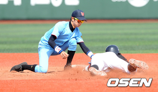 15일 오전 서울 목동야구장에서 열린 '2012 고교야구 주말리그' 장충고와 휘문고의 경기, 3회초 무사 1루 장충고 박찬호 타석때 1루주자 원혁재가 도루에 실패하고 있다.