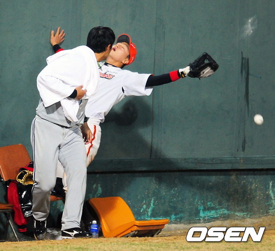 18일 오후 충청북도 청주구장에서 열린 '2012 팔도 프로야구' 한화 이글스와 LG 트윈스의 경기에서 5회초 첫타석에서 LG 오지환의 타구를 이여상이 잡기 위해 LG 김광삼이 앉아 있는 불펜앞까지 달려왔으나 볼을 놓치고 있다.