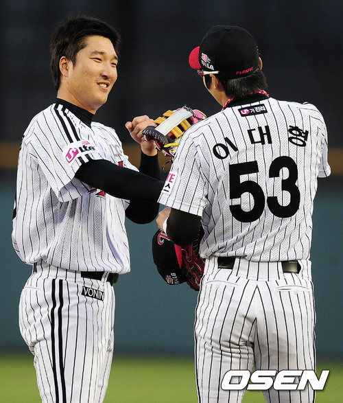 1회말 선취점을 뽑은 LG 이진영과 이대형이 하이파이브를 하고 있다. 이대형은 무사에서 3루타를 이진영은 1사 3루에서 선제 적시 2루타를 날렸다.