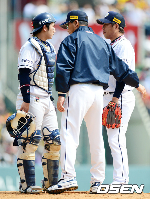 2회초 1사 3루에서 두산 김승회가 KIA 차일목에 선제 1타점 적시타를 허용하자 김진욱 감독이 마운드에 올라 김승회를 격려하고 있다.