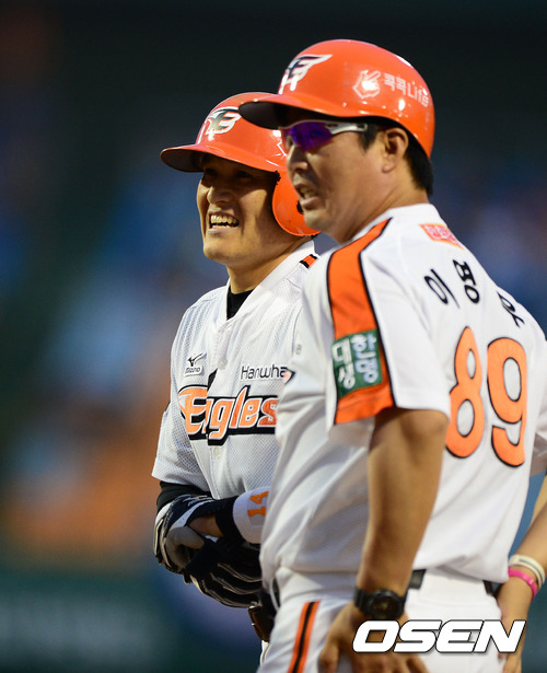 22일 오후 대전구장에서 열린 '2012 팔도 프로야구' 한화 이글스와 두산 베어스의 경기, 4회말 1사 2,3루에서 한화 이대수가 1타점 적시타를 날리고 더그아웃을 바라보며 미소짓고 있다.