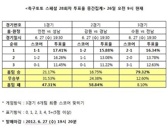 [축구토토] 국민체육진흥공단(www.kspo.or.kr)이 발행하는 체육진흥투표권 수탁사업자인 스포츠토토 공식 온라인 발매 사이트인 베트맨(www.betman.co.kr)은 오는 27일 펼쳐지는 인천-성남(1경기), 강원-경남(2경기), 수원-전남(3경기)전 등 K-리그 3경기를 대상으로 한 축구토토 스페셜 28회차 투표율 중간집계 결과, 축구팬 79.32%는 3경기 수원-전남전에서 수원의 승리를 예상했다고 밝혔다.
