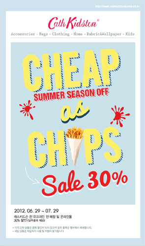 영국 라이프 스타일 브랜드 '캐스 키드슨(Cath Kidston)'은 6월 29일부터 7월 29일까지 한달동안 '2012 여름 시즌 오프 행사'를 진행하고, 30%로 할인된 가격으로 선보인다. 단, 일부상품은 제외다.