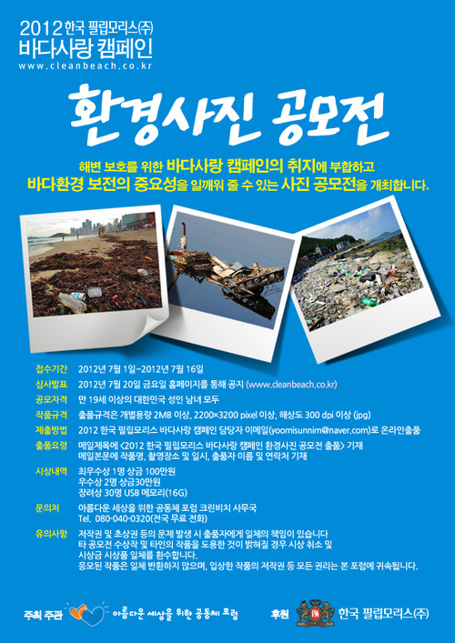 NGO '아름다운 세상을 위한 공동체포럼'은 올 여름 전국 해수욕장에서 해변 쓰레기를 줍고 오폐물을 처리하는 환경보호 캠페인에 동참할 ‘2012 한국 필립모리스 바다사랑 캠페인’의 자원봉사자를 모집한다.