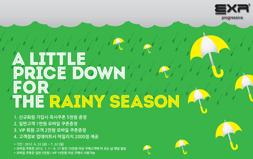 EXR 레인 캠페인은 7월 22일까지 EXR 멤버십 고객을 대상으로 비가 오는 날 사용 가능한 모바일 할인 쿠폰을 제공하는 이벤트다. 이번 행사는 올해 1월부터 6월까지 10만 원 이상을 구매한 EXR 멤버십 회원을 대상으로 진행되며 일반 회원에게는 1만원, VIP회원에게는 2만원의 모바일 할인 쿠폰을 제공한다.