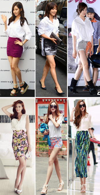소녀시대 서현은 화이트 셔츠와 퍼플컬러 미니스커트를 매치해 감각을 뽐냈다. 스커트의 주름 디테일이 밋밋함을 없애 더욱 트렌디하고 섹슈얼한 분위기가 난다. 김희애 역시 화이트 셔츠에 비비드 컬러는 아니지만 수묵화를 연상시키는 미니스커트로 나이를 잊게 하는 완벽한 몸매와 스타일을 보여줬다.