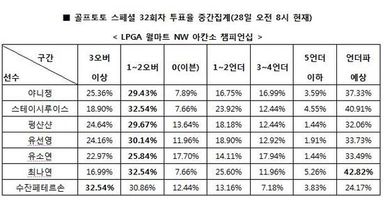 [골프토토] 국내 골프팬들은 LPGA 월마트 NW 아칸소 챔피언십에서 언더파 예상이 42%로 나타난 최나연을 비롯해 대상선수들 모두 1라운드에서 좋은 성적을 거두기 어려울 것으로 예상했다.