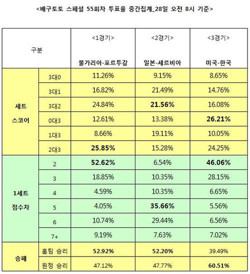 [배구토토] 국민체육진흥공단(www.kspo.or.kr)이 발행하는 체육진흥투표권 수탁사업자인 스포츠토토 공식 온라인 발매사이트 베트맨(www.betman.co.kr)이 오는 30일 열리는 2012 월드리그 마지막 4주차 불가리아-포르투갈(1경기)전, 일본-세르비아(2경기)전, 미국-한국(3경기)전 등 총 3경기를 대상으로 한 배구토토 스페셜 55회차 게임 투표율 중간집계 결과 미국-한국(3경기)전에서 참가자들의 60.51%는 한국의 승리를 내다봤다고 전했다.
