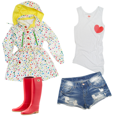 패턴이 강한 아이템에는 상대적으로 심플한 이너와 팬츠를 매치하는 것이 좋다. 화이트 컬러에 심플한 하트 프린트가 돋보이는 민소매에 데님 숏팬츠를 매치하면 쉽고 간단한 스타일링이 완성된다. 이에 비비드한 다프나의 레인부츠를 더하면 무거운 장마철의 분위기를 산뜻하게 바꿀 수 있다.