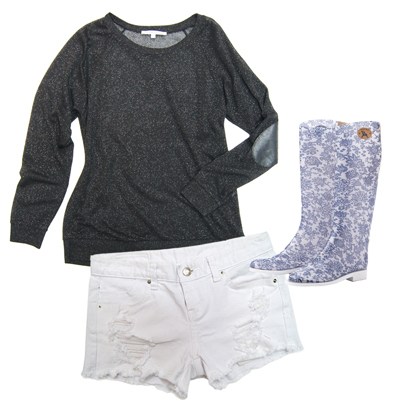 채도가 낮은 스타일링에는 패턴이나 색감이 강한 레인부츠로 포인트를 주는 것이 센스있는 코디. 디스트로이드 디테일이 눈에 띄는 화이트 숏팬츠는 길이가 긴 레인부츠를 부담 없이 소화할 수 있게 도와줄 것이다.