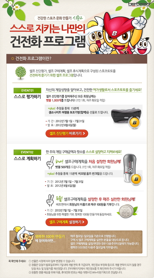 이번 캠페인은 베트맨이 현재 운영중인 셀프진단평가, 셀프구매계획, 셀프휴식계획 등 '스스로 지키는 나만의 건전화 프로그램'을 통해 보다 건전하게 스포츠토토 게임을 즐길 수 있도록 하기 위해 마련됐다.