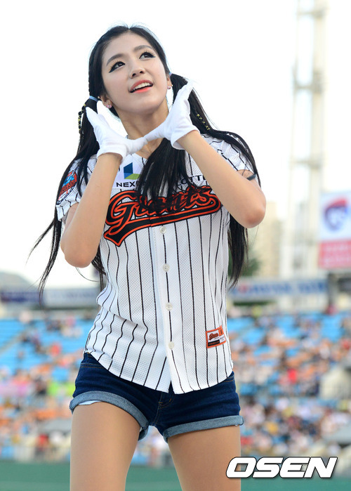 3일 오후 부산 사직구장에서 열린 '2012 팔도 프로야구' 롯데 자이언츠와 SK 와이번스의 경기, 롯데 치어리더 김연정이 열띤 응원을 하고 있다.