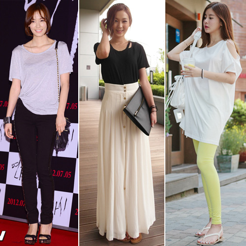 더불어 살갗을 노출하는 ‘베어 룩’ 역시 효과적이다. 어깨나 쇄골, 등처럼 팔뚝에 비교하여 살이 없는 부위를 노출함으로써 시선을 분산시켜 마치 날씬해 보이는 효과를 낼 수 있는 것.