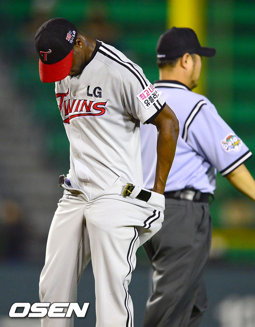 24일 오후 서울 잠실구장에서 열리는 2012 팔도 프로야구 두산 베어스와 LG 트윈스의 경기 3회초 LG 리즈가 바지를 고쳐 입고 있다