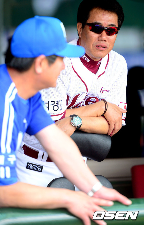 27일 서울 목동구장에 열린 '2012 팔도 프로야구' 넥센 히어로즈와 삼성 라이온즈의 경기전 넥센 김시진 감독과 삼성 류중일감독이 이야기를 나누고 있다.