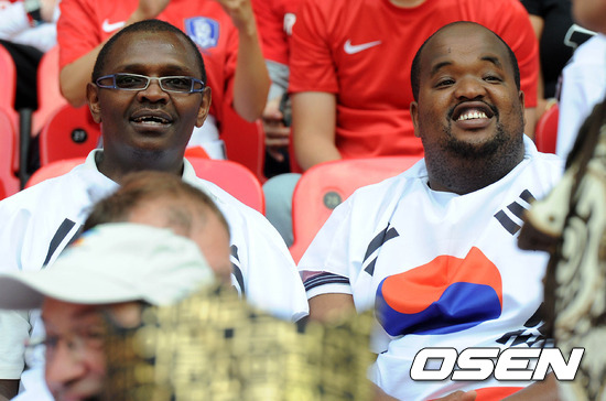 [OSEN=런던(영국), 올림픽공동취재단] 2일(한국시간) 새벽 영국 런던 웸블리 스타디움에서 벌어진 2012런던올림픽 남자축구 조별리그 B조 최종전 가봉과의 경기, 관중들이 태극기 티셔츠를 입고 응원을 하고 있다.