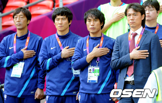 [OSEN=런던(영국), 올림픽공동취재단] 2일(한국시간) 새벽 영국 런던 웸블리 스타디움에서 벌어진 2012런던올림픽 남자축구 조별리그 B조 최종전 가봉과의 경기에 앞서 홍명보 감독을 비롯한 코칭스태프가 국기에 대한 예를 취하고 있다.