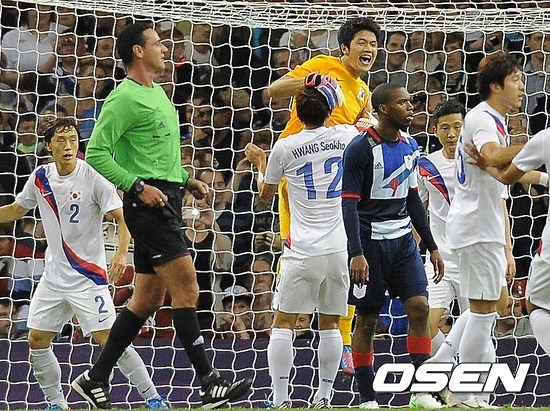 [OSEN=카디프(영국), 올림픽공동취재단] 5일(한국시간) 새벽 웨일즈 카디프시티의 밀레니엄 스타디움에서 열린 2012런던올림픽 남자축구 8강전을 영국과의 경기 전반 정성룡이 페널티킥을 막고 환호하고 있다.