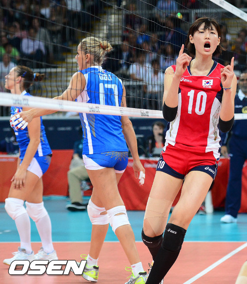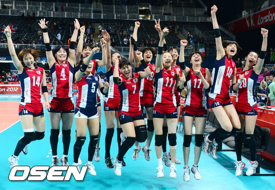 한국은 8일 새벽(한국시간) 영국 런던 얼스코트에서 열린 2012 런던올림픽 여자 배구 8강전에서 이탈리아에 세트 스코어 3-1(18-25, 25-21, 25-20, 25-18)로 극적인 역전승을 거두고 준결승에 진출했다.