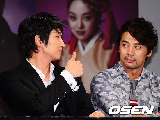 10일 오후 서울 중구 장충동 그랜드 앰배서더 서울 그랜드볼룸에서 열린 MBC 새 수목드라마 ‘아랑사또전’(극본 정윤정, 연출 김상호) 제작발표회에서 이준기가 권오중에게 최고라는 사인을 보내고 있다.