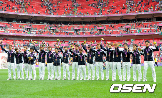 [OSEN=런던(영국), 올림픽공동취재단] 홍명보 감독이 이끄는 올림픽 축구 대표팀이 12일(이하 한국시간) 영국 런던 웸블리 스타디움에서 열린 시상식에서 동메달을 목에 걸었다.